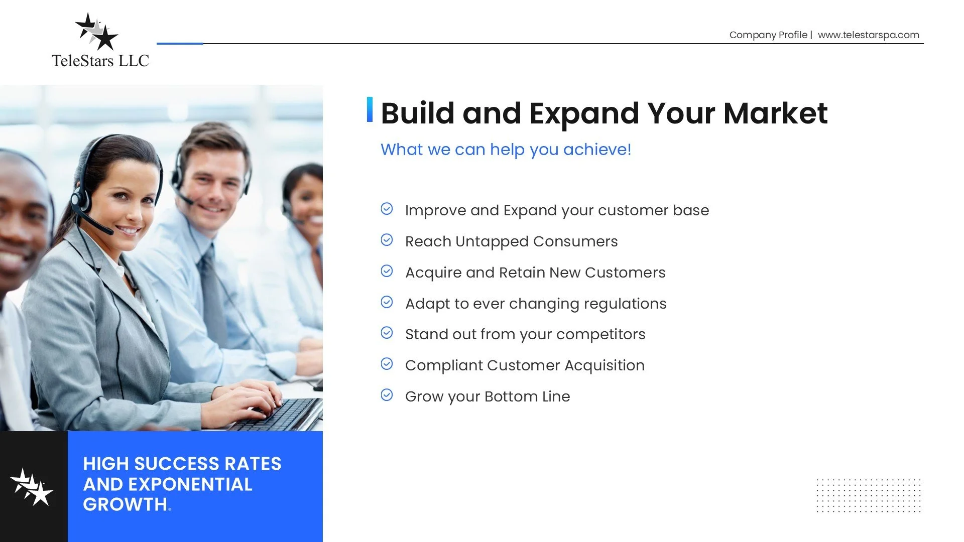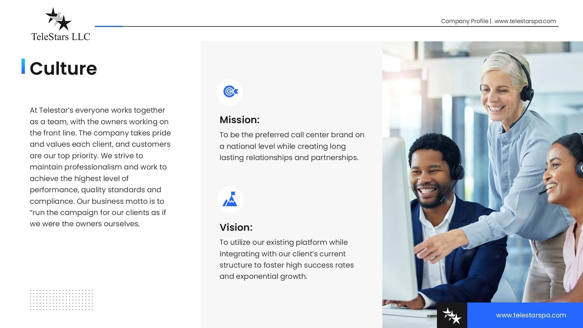 The mission of TeleStars is to provide our clients with unparalleled professional service in the areas of customer acquisition, retention and care.